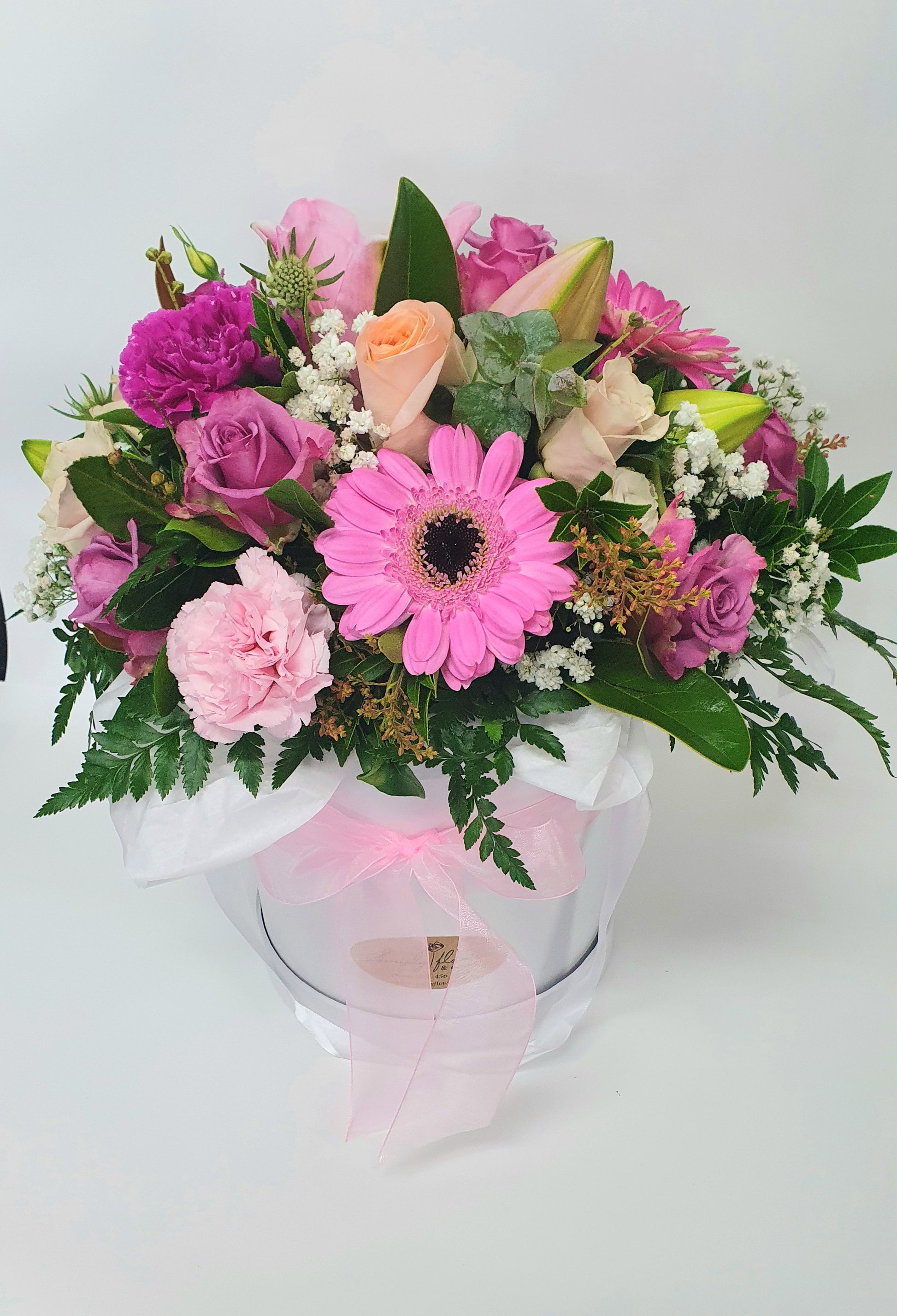 A stylish arrangement in a cute hat box. This stunning arrangement is created in what ever colour tones you desire.
