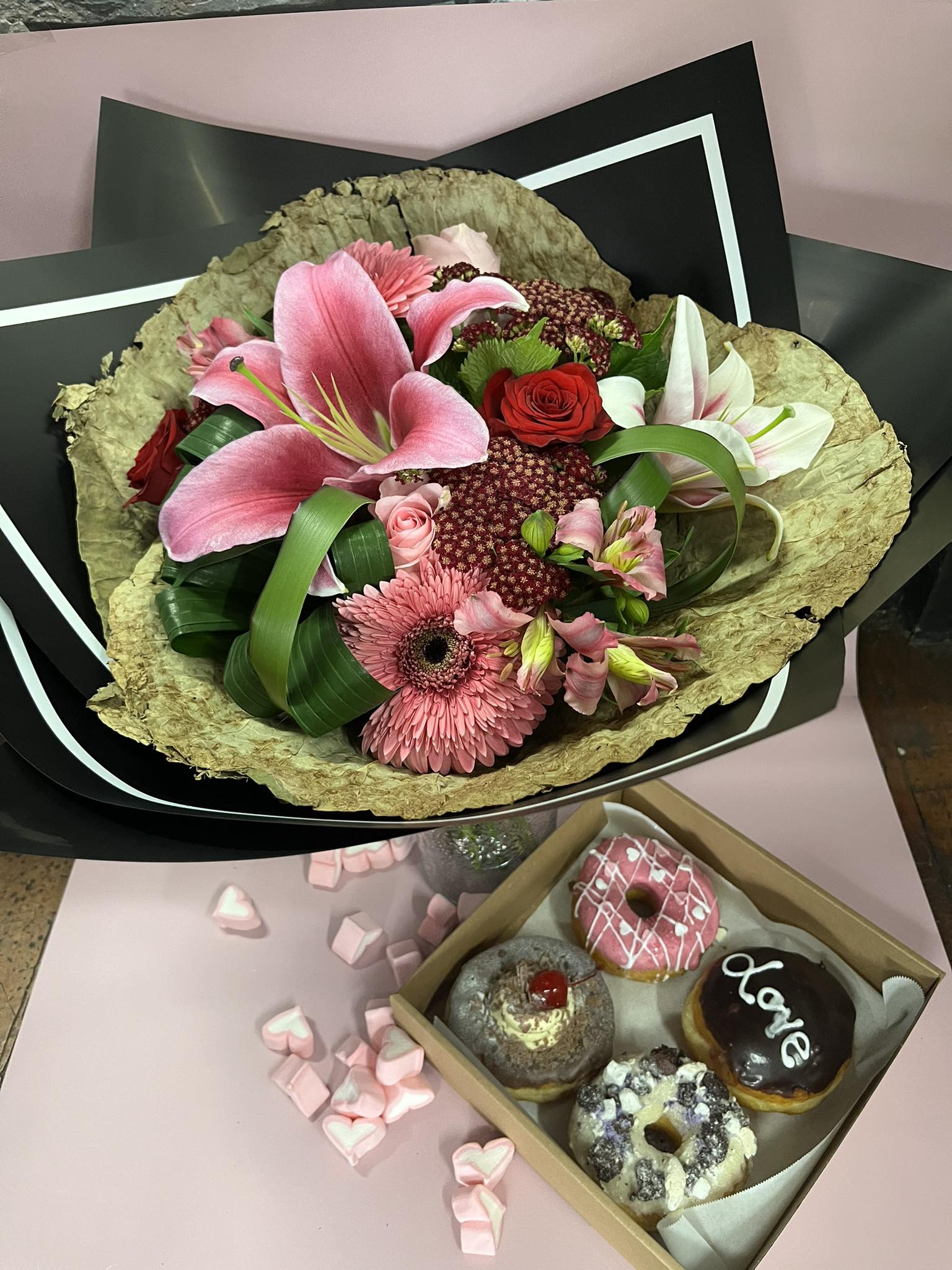 We have teamed up with the beautiful local team from Casa Valencia to bring you the most mouth watering treat....4 delicious donuts specifically designed and made for this deal accompanied by a striking fresh bouquet in whites, pinks and reds the perfect combination to satisfy your cravings.