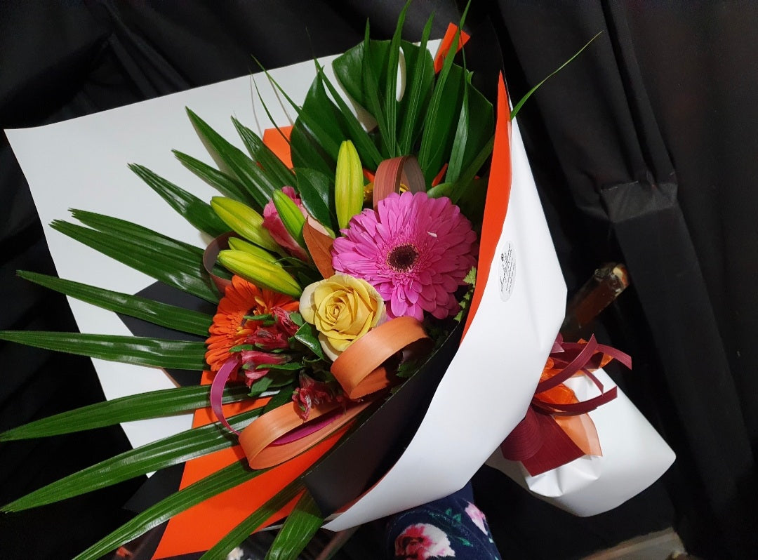 Flowers will vary to those pictured and will be selected as close as possible to the picture due to seasonal availability. Wrap may also vary to that picture and will be selected to compliment the flowers.
