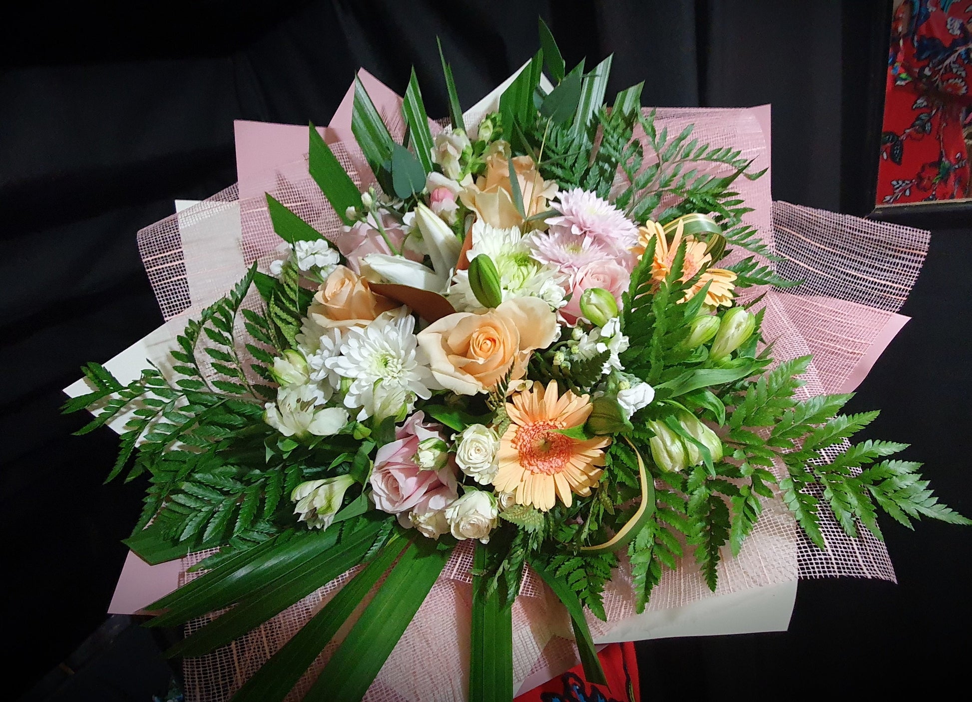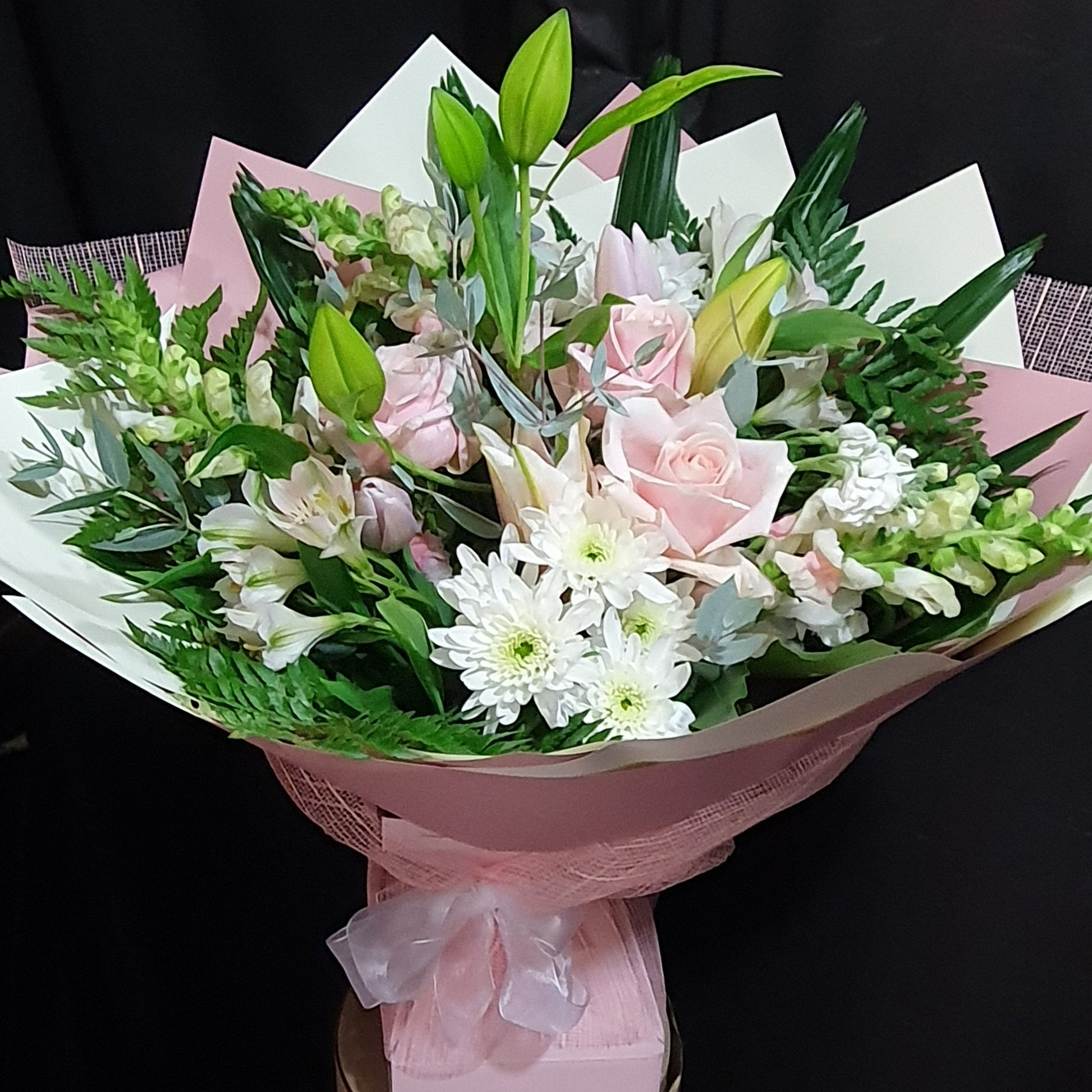 Beautiful cottage / garden inspired bouquet with soft foliage wrapped beautifully in complimentary papers, and presented in either its own waterfilled box or glass vase.