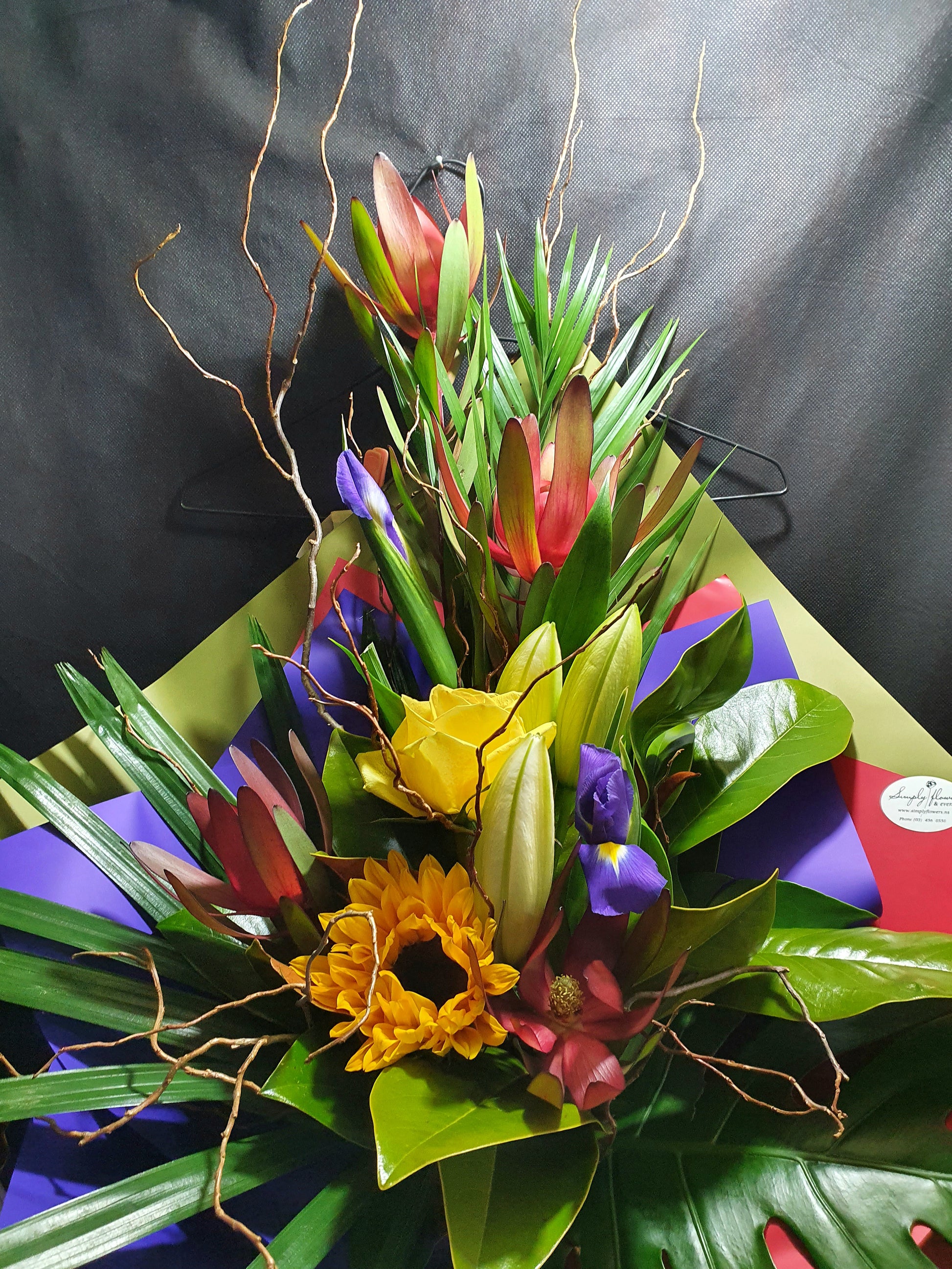 Beautiful hand tied upright bouquet, with lush green foliage and gorgeous fresh seasonal flowers, a mix of textures and glorious primary colours.