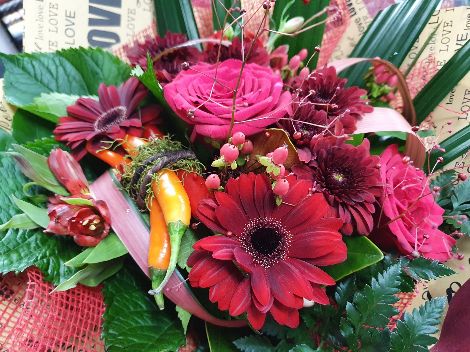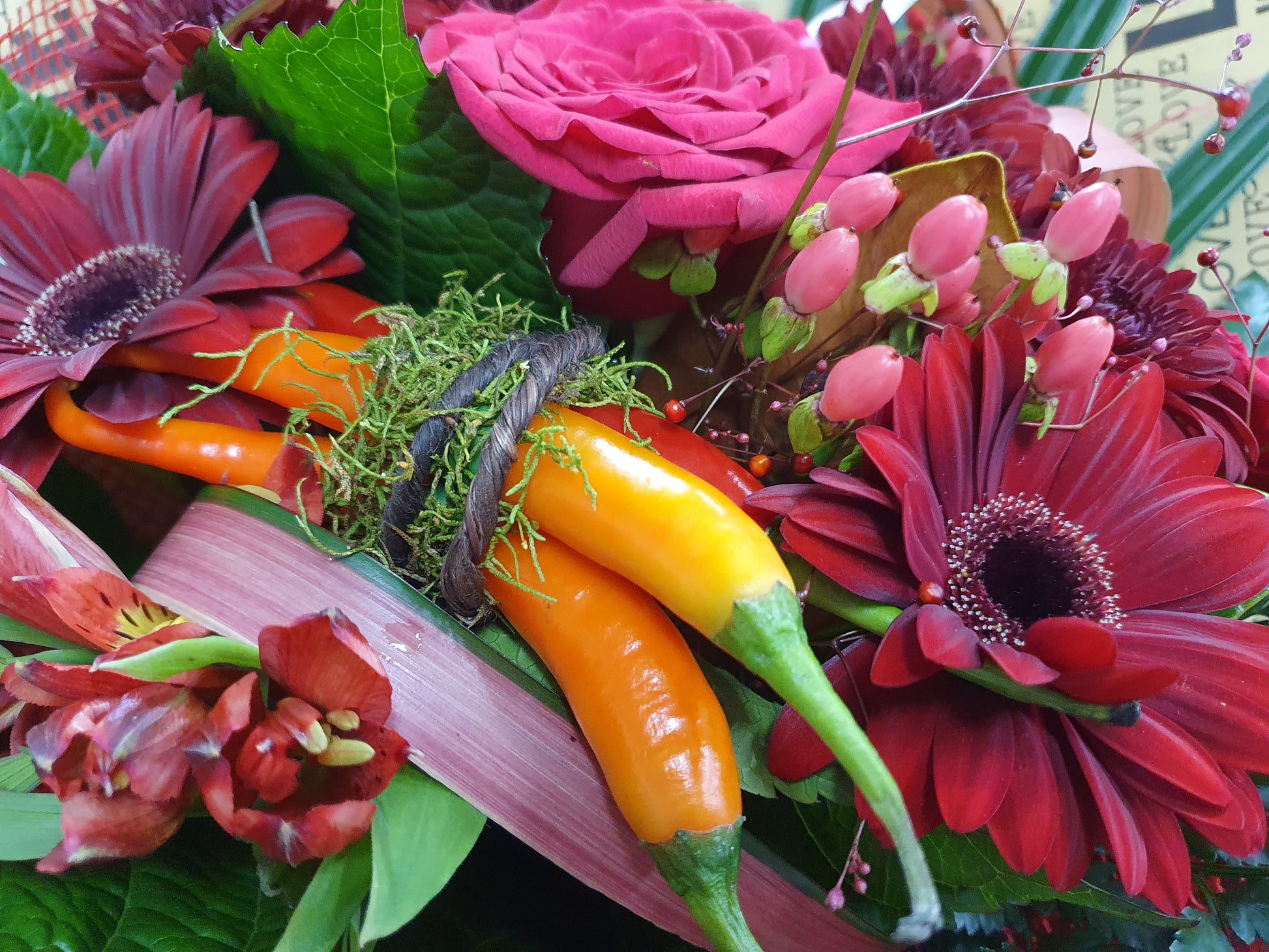 A beautiful vibrant mixed selection of red and orange flowers and lush greenery incorporating fresh chilis if the season is permitting or artificial if not. This hot little number is a little spicy but Ill guarantee you'll love it !!